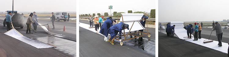 一、聚酯玻纖布必須在熱瀝青上進行安裝施工。我們推薦以下的瀝青。AC-20;PG64-22;AR8000; 或者刺入等級為60-80的瀝青。對極端高溫的夏季施工,推薦采用粘度比較高的瀝青,以下瀝青比較適合夏季施工:AC-30;PG67-22;AR8000;或者刺如等級為40-60的瀝青。
